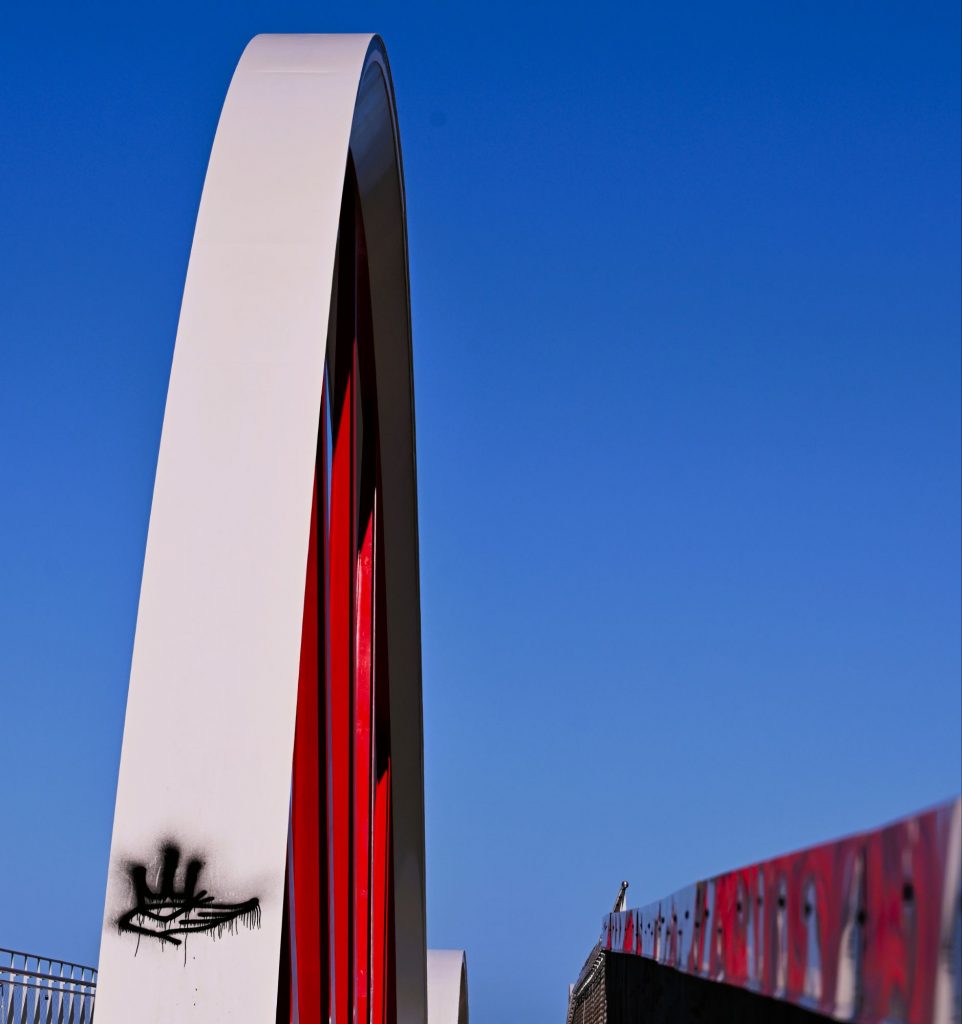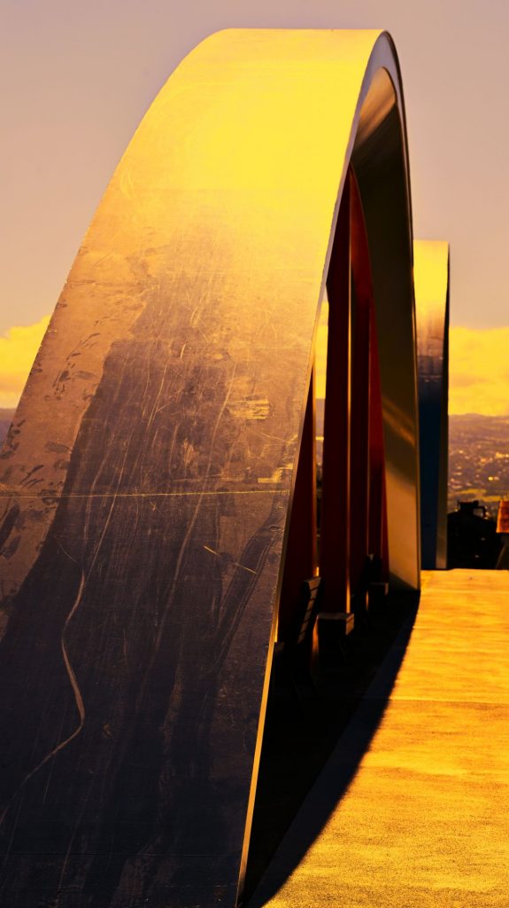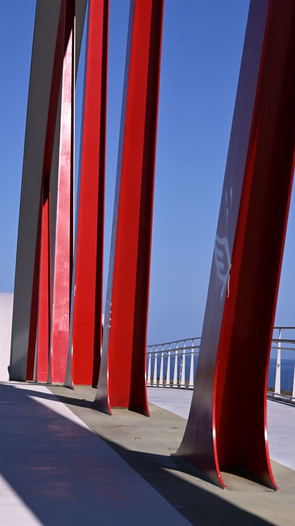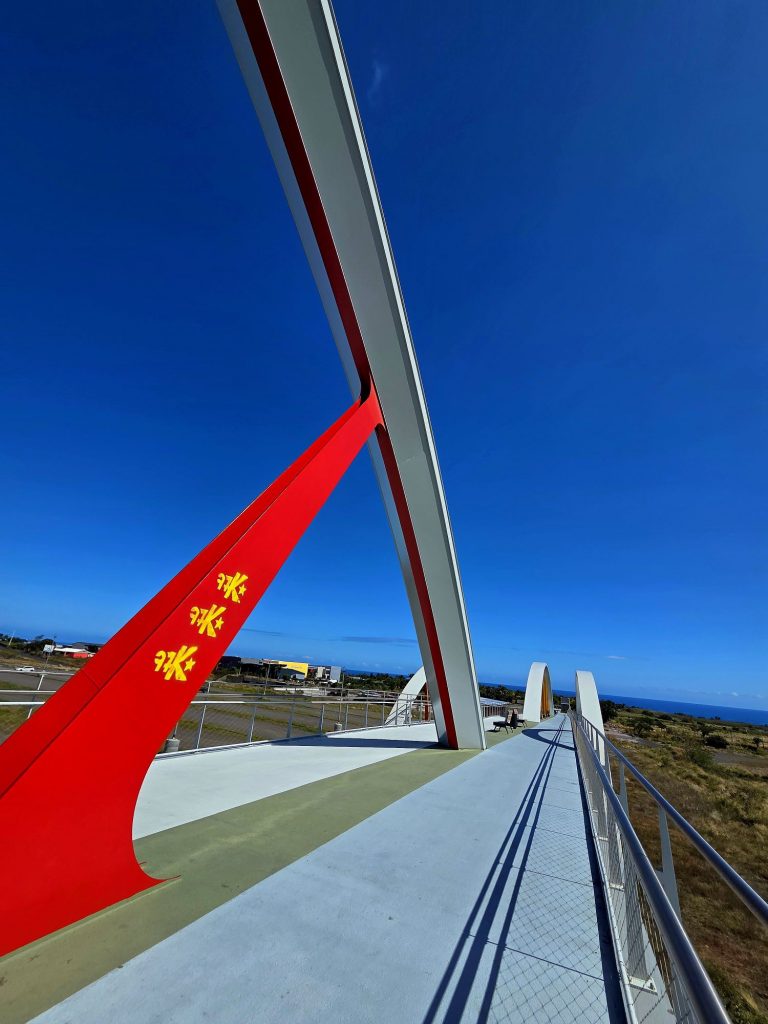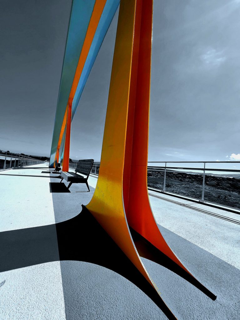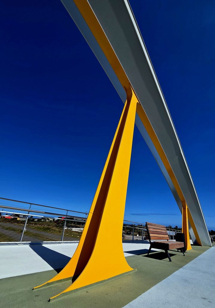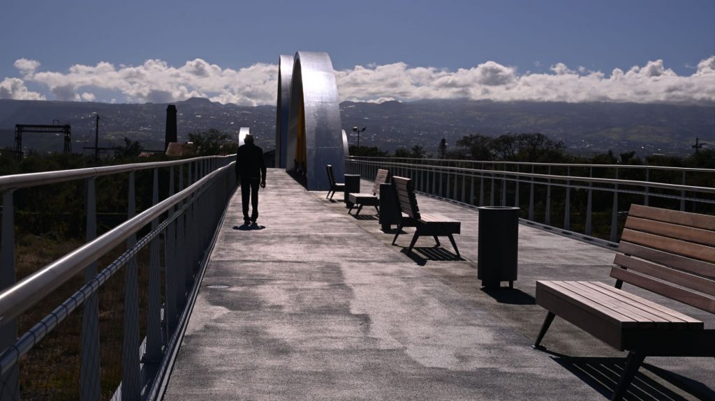 Le nouveau pont jaune et rouge passerelle piétonnier cyclable,qui a été installée au dessus de la ravine du gol à St louis